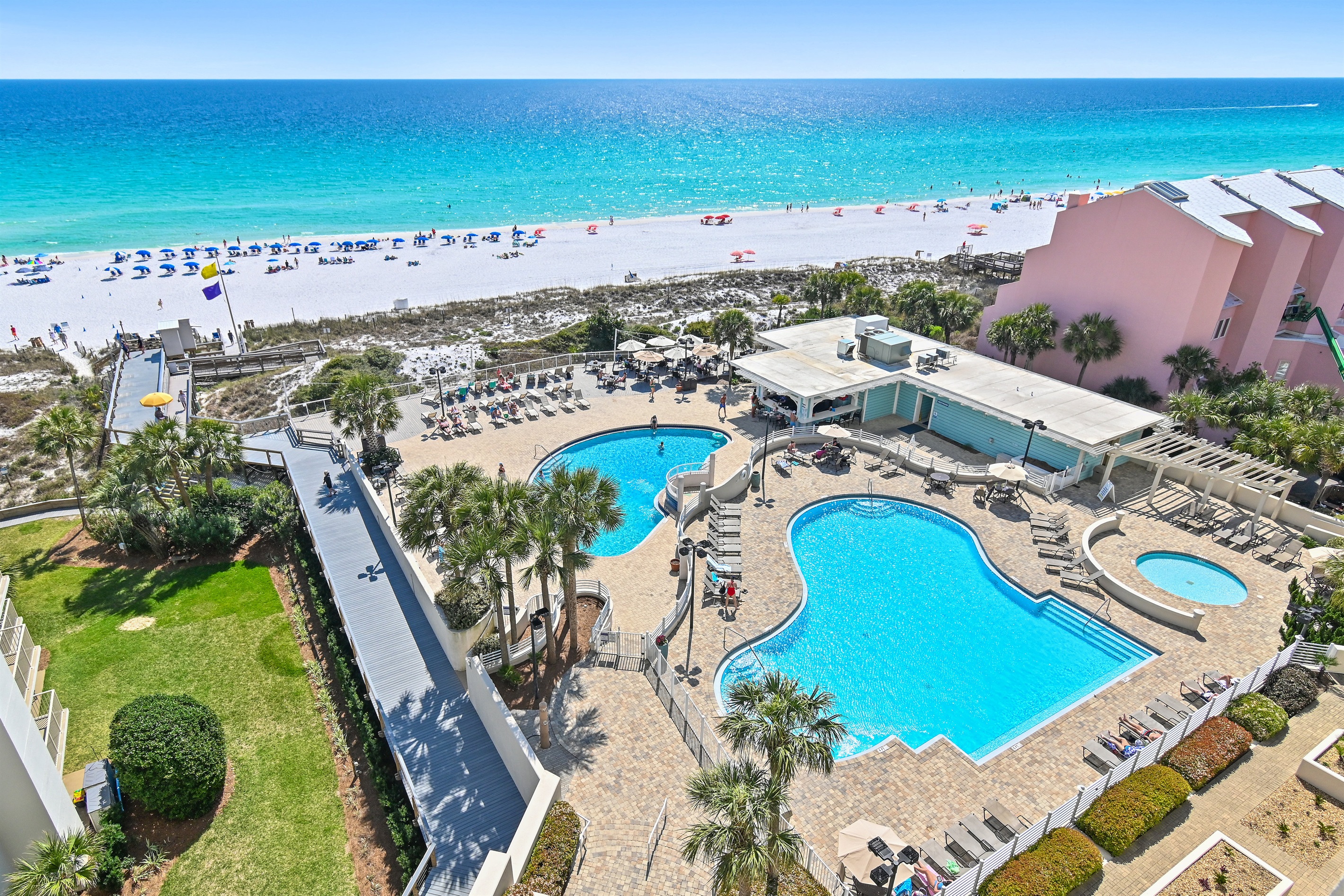 Immerse yourself in the beauty of the soft white, powdery sand and clear emerald-green waters just steps away from the condo. Our beach was voted the #1 Best Beach in the nation by Southern Living magazine! Seasonal daily chair rentals are offered along the resort's 600 ft. of private beach.