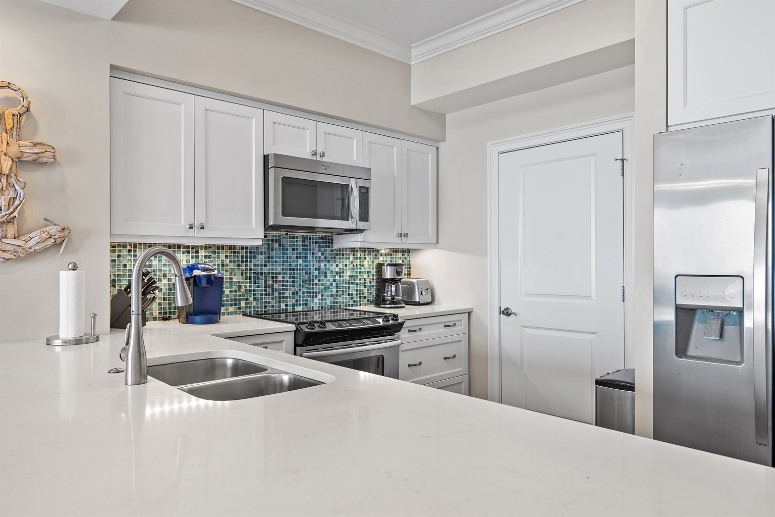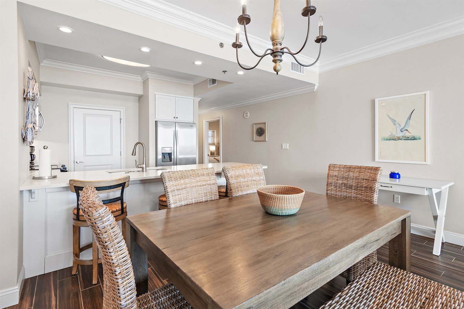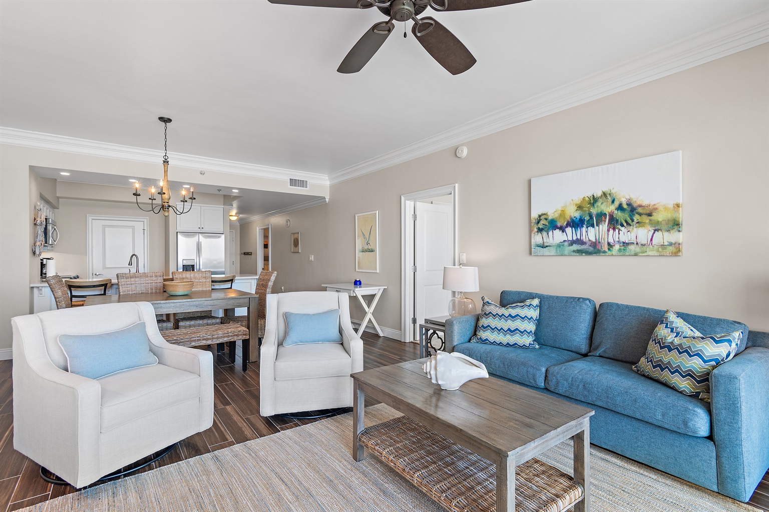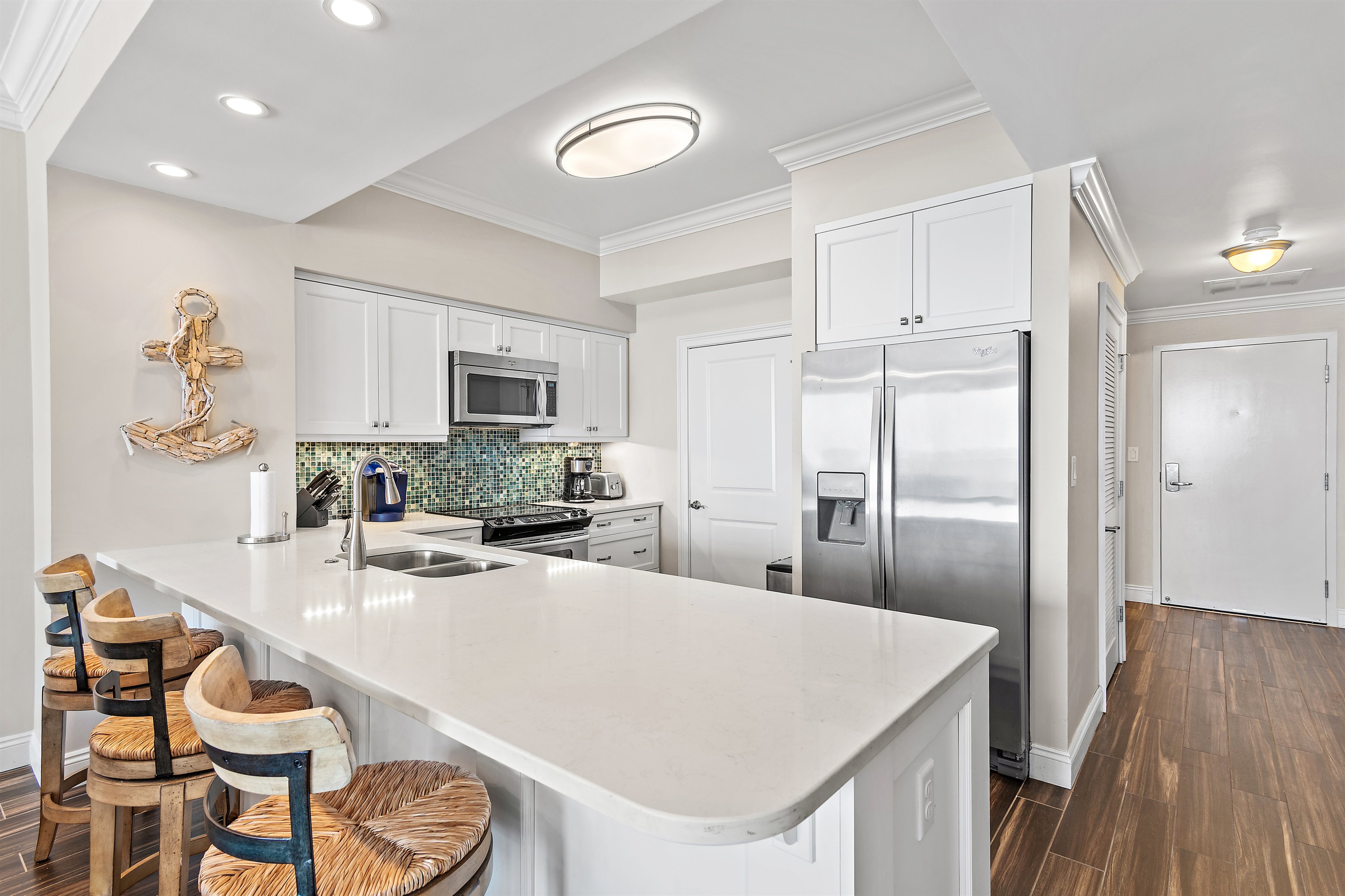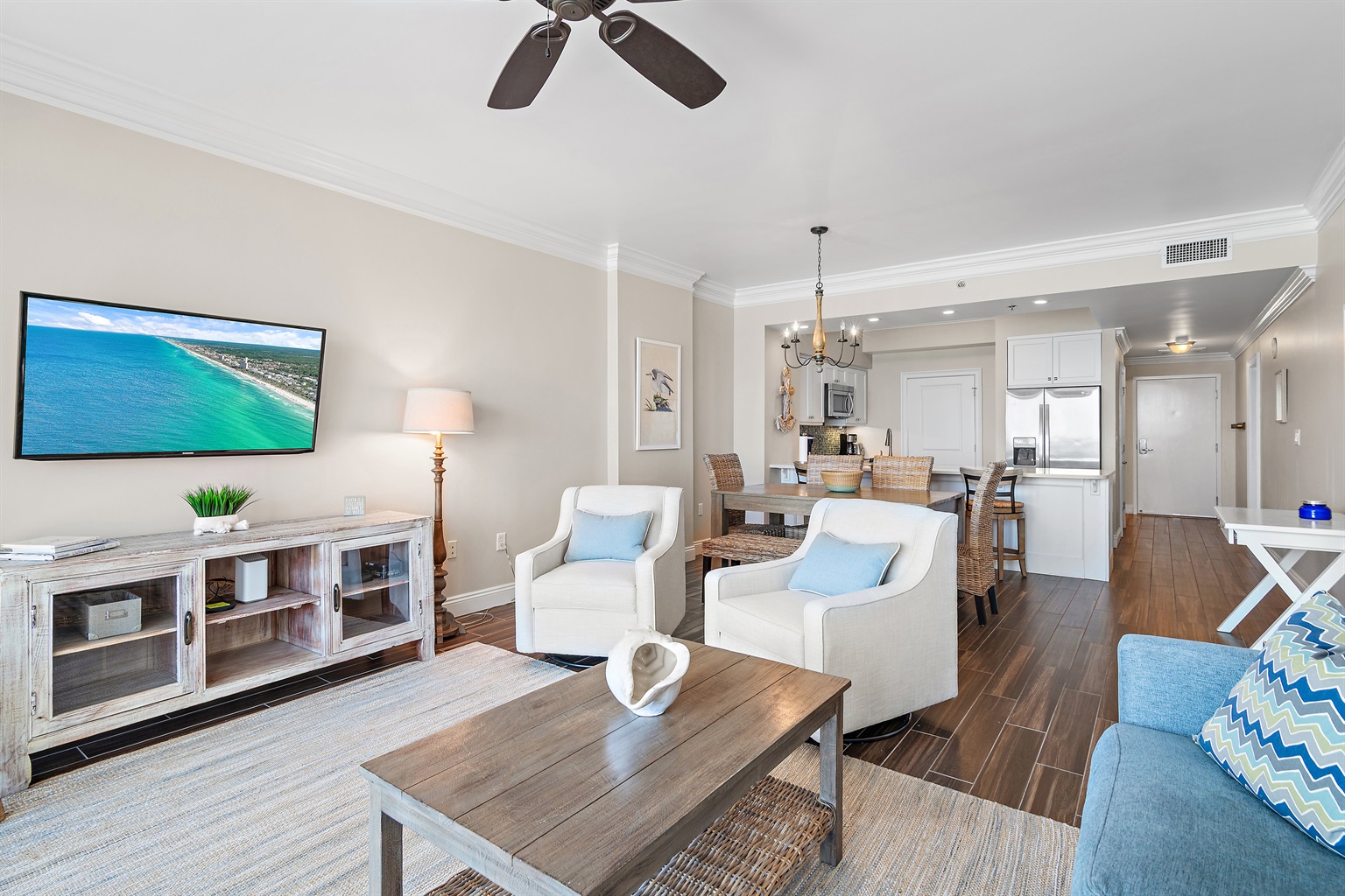Cozy up in a warm, comfortable setting with flat-screen TVs throughout. The kitchen is beautifully decorated and fully equipped. The condo has a full-size washer/dryer, secure WIFI connection, along with Cable TV.