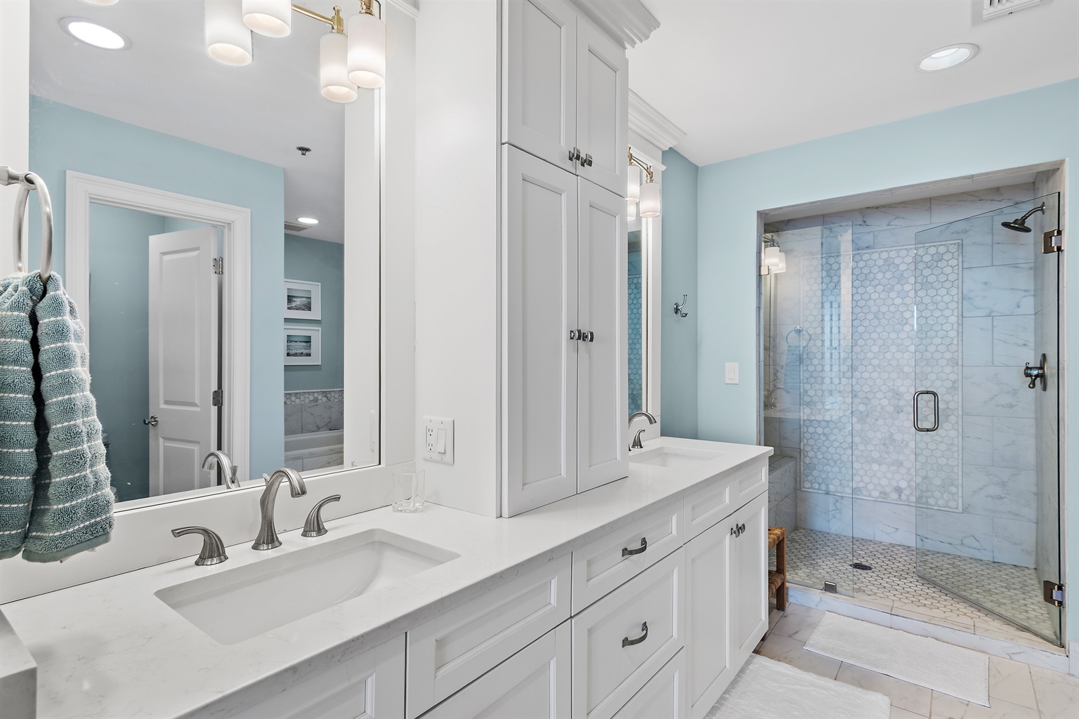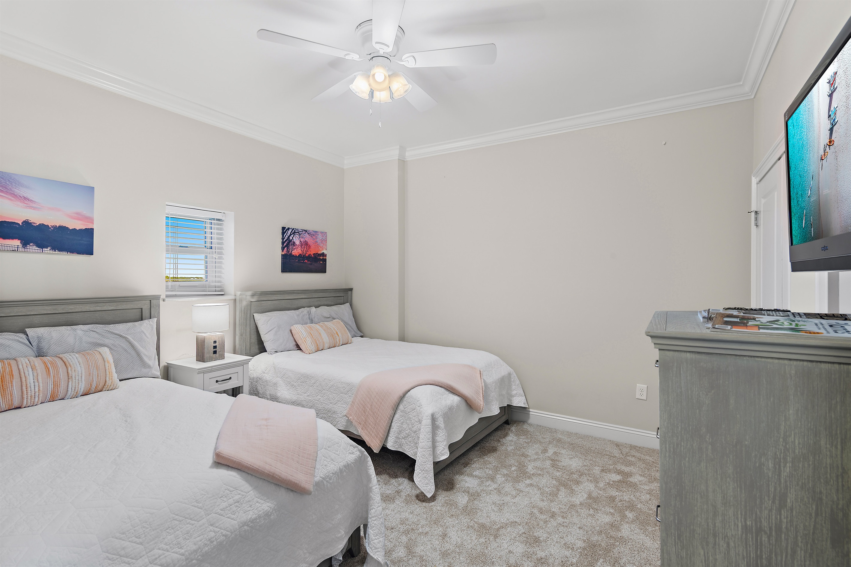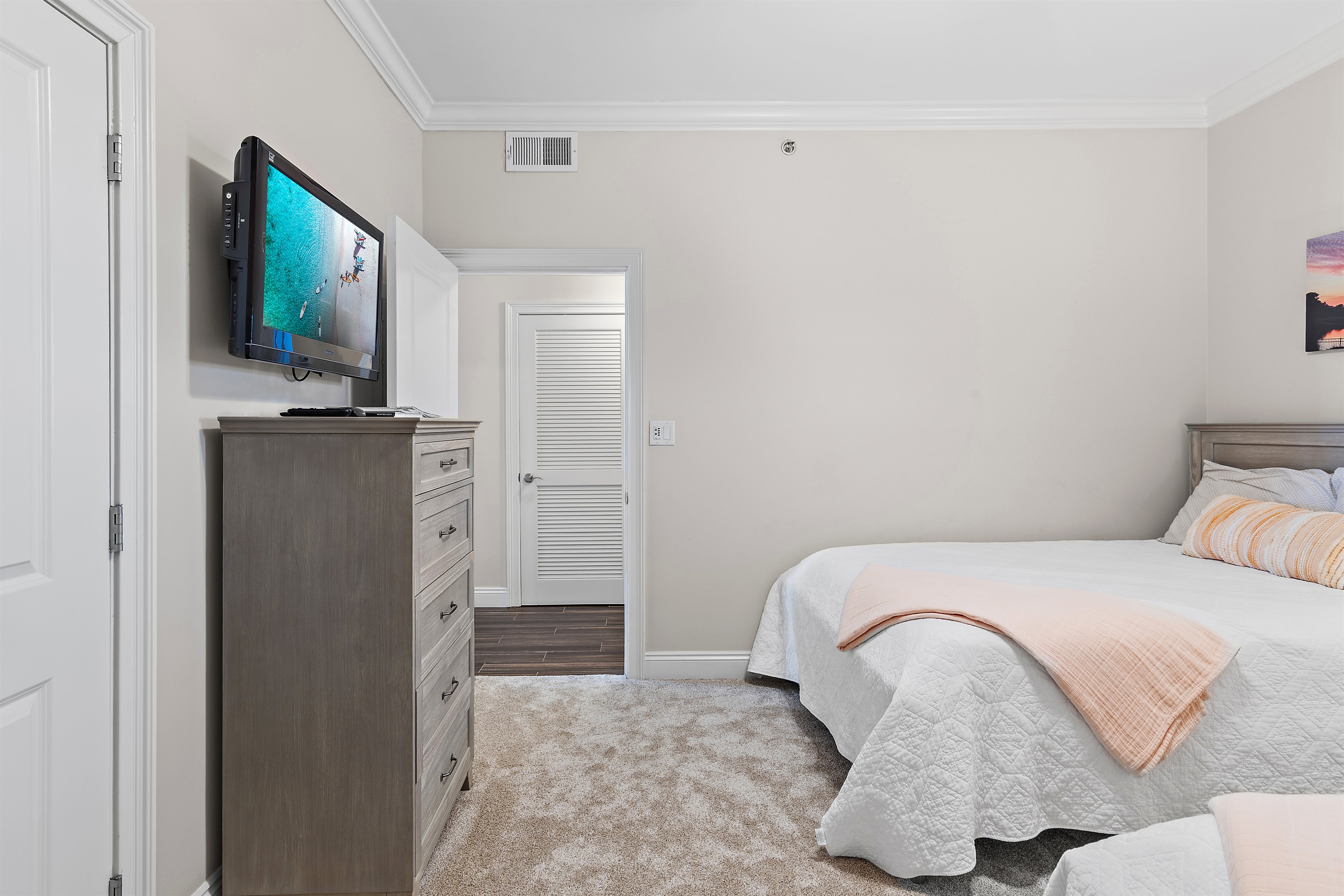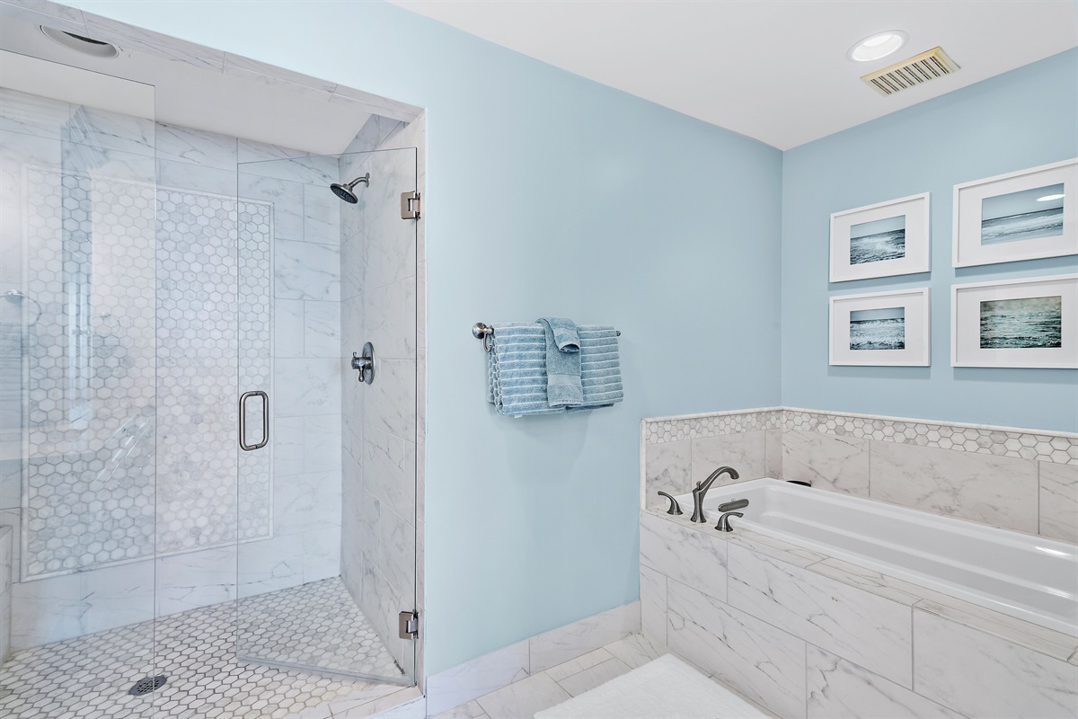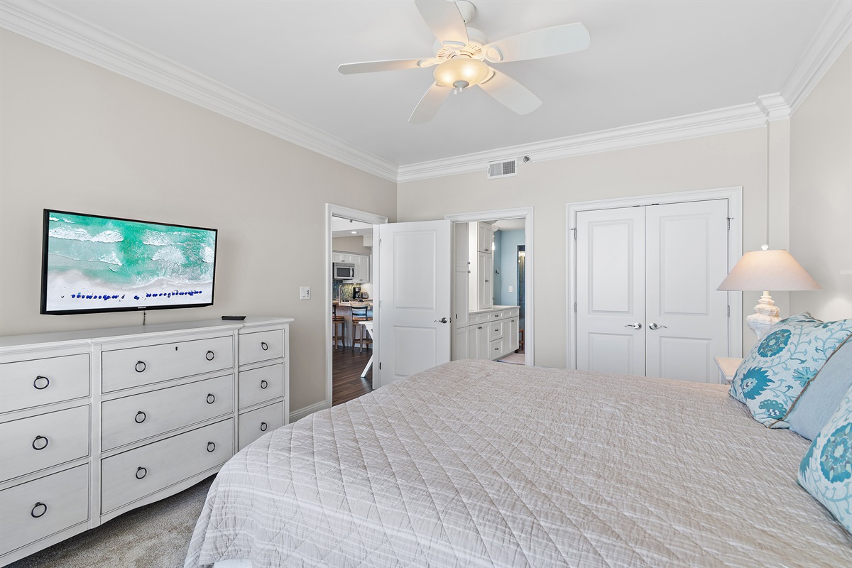 The Master Suite features a king-size bed and a large flat-screen TV. The master bath has a bathtub and a walk-in shower. The second bedroom has 2 full-size beds and a flat-screen TV.