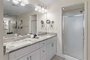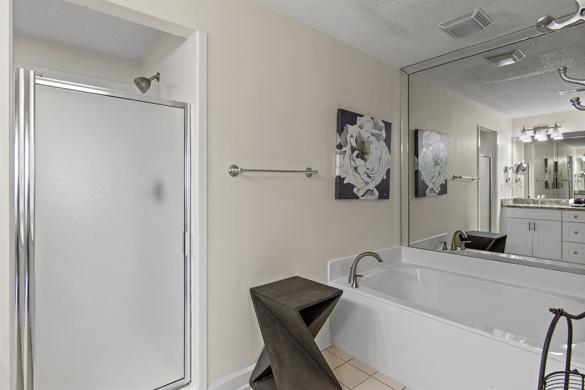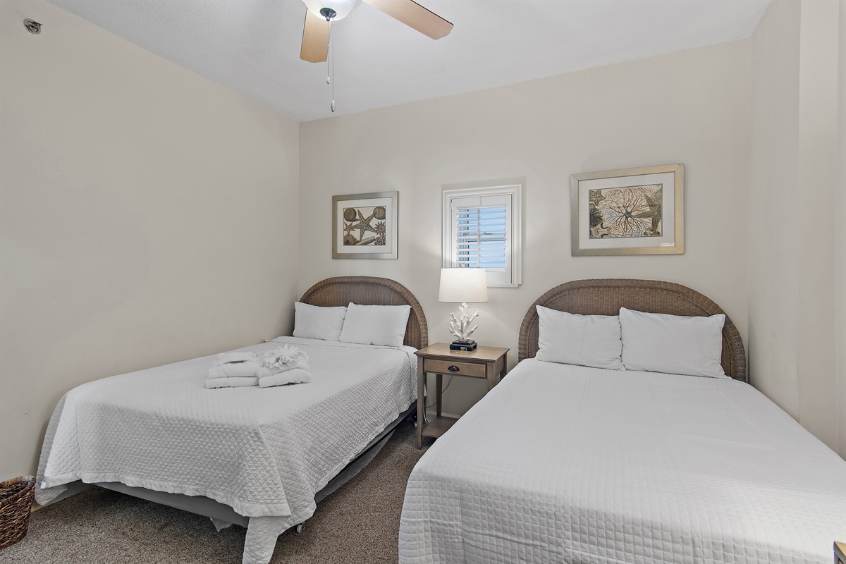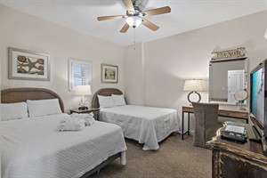 The Master Suite features a king-size bed and a large flat-screen TV. The master bath has a bathtub and a walk-in shower. The second bedroom has 2 full-size beds and a flat-screen TV.