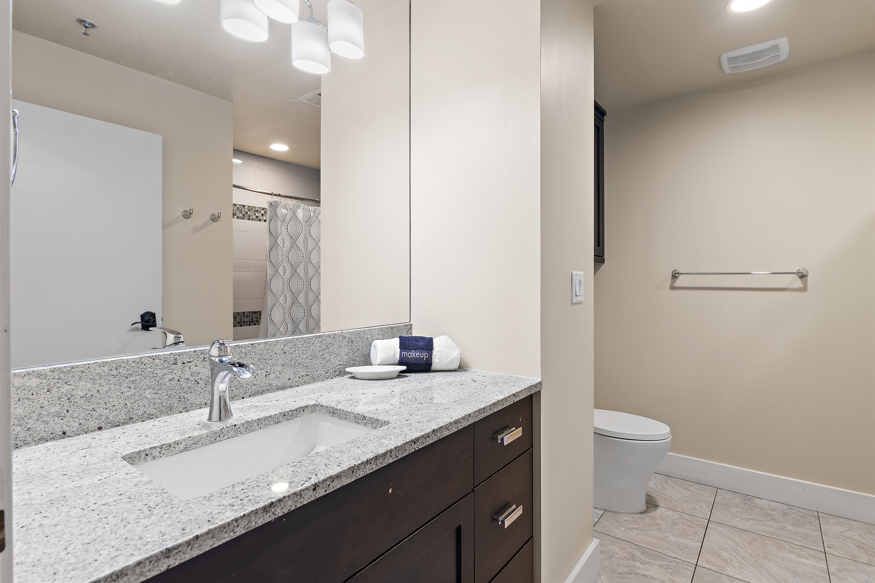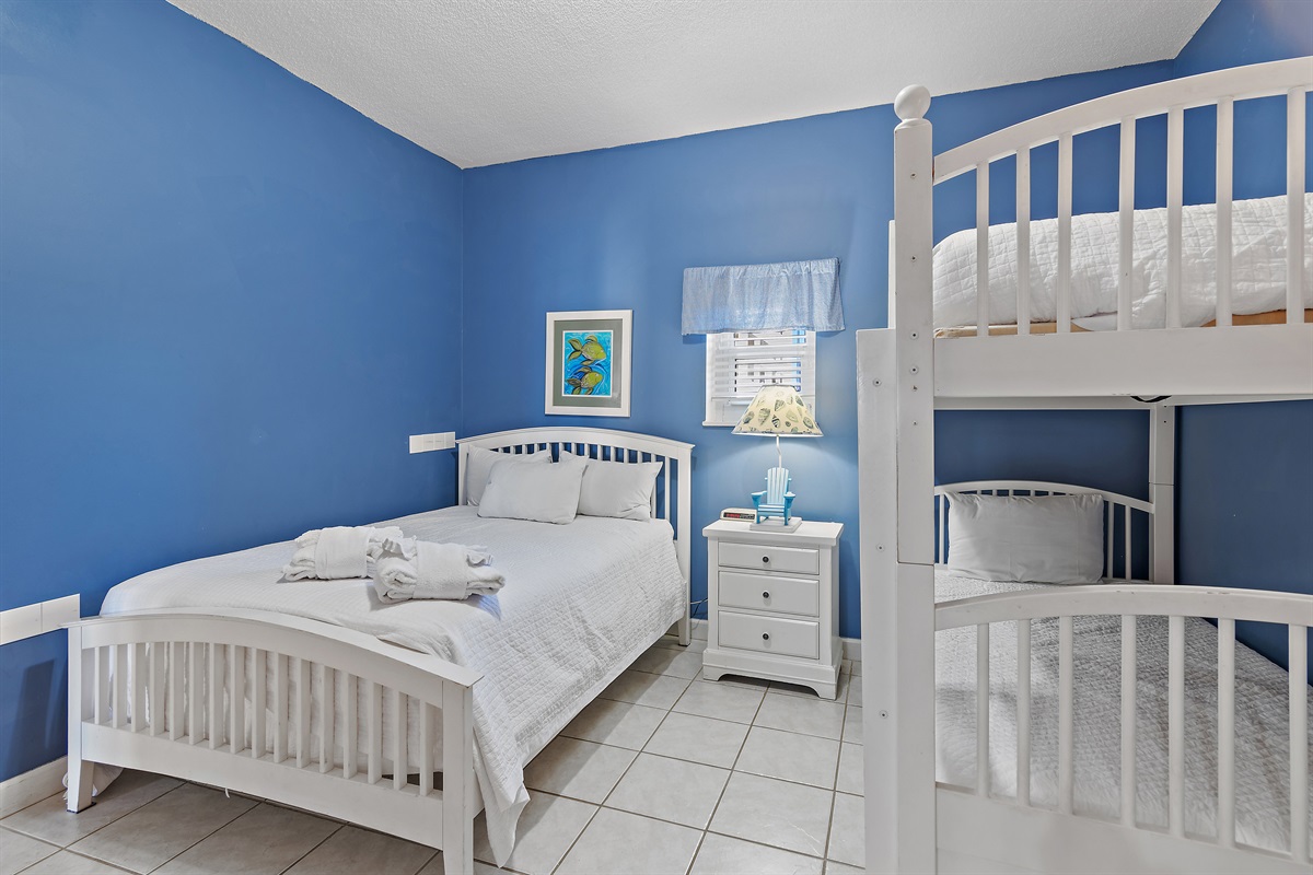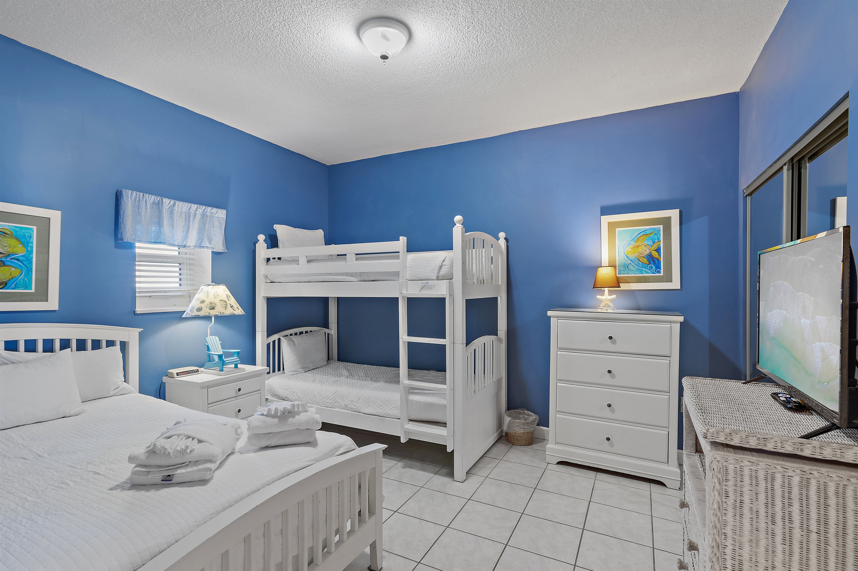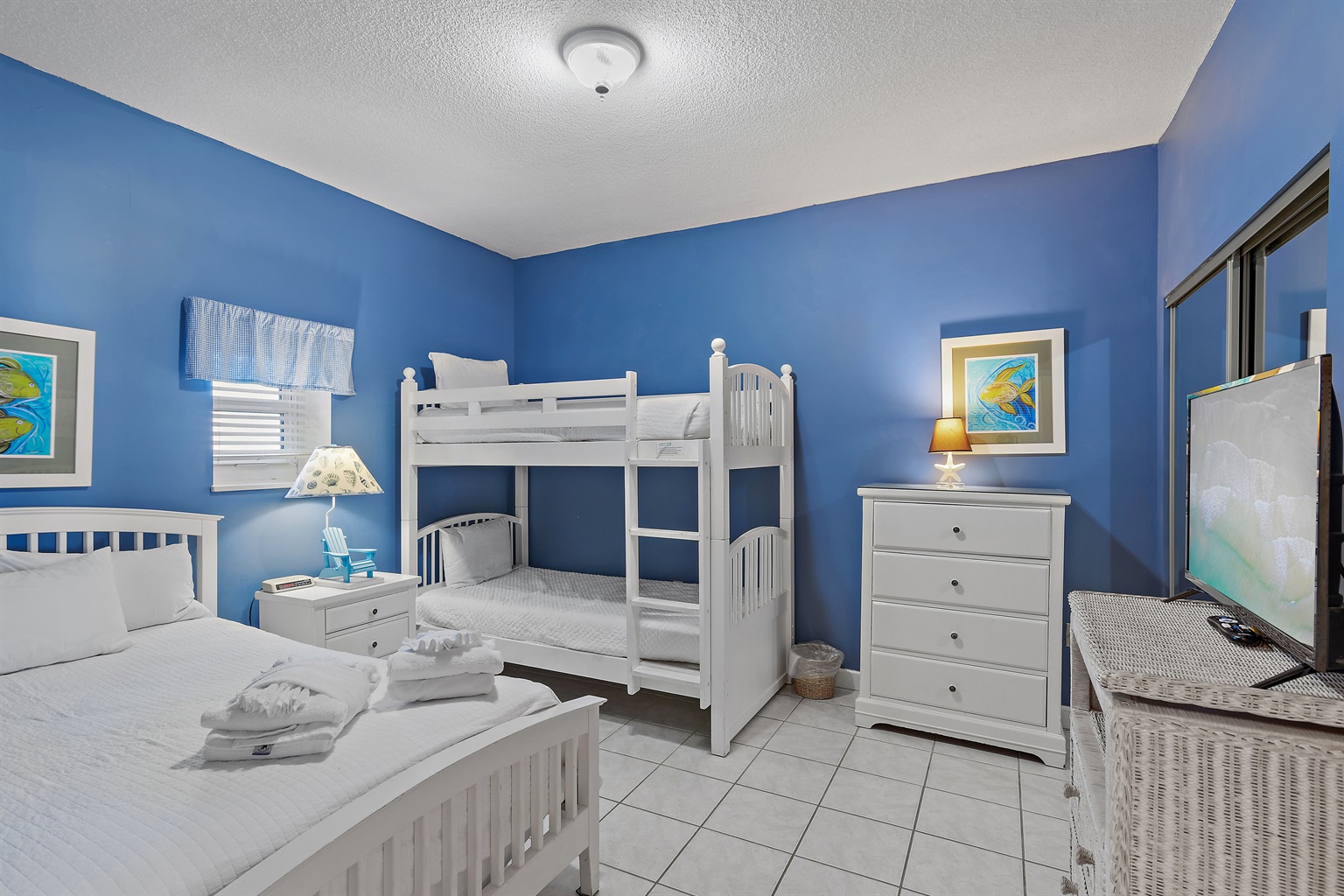 The second bedroom has a full-size bed, along with low bunks providing easier access for our youngest guests. The second bedroom also includes a flat-screen TV.
