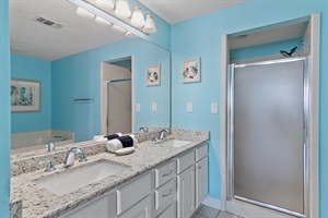 The Master Suite features a king-size bed and a large flat-screen TV. The master bath has a jetted bathtub and a walk-in shower.