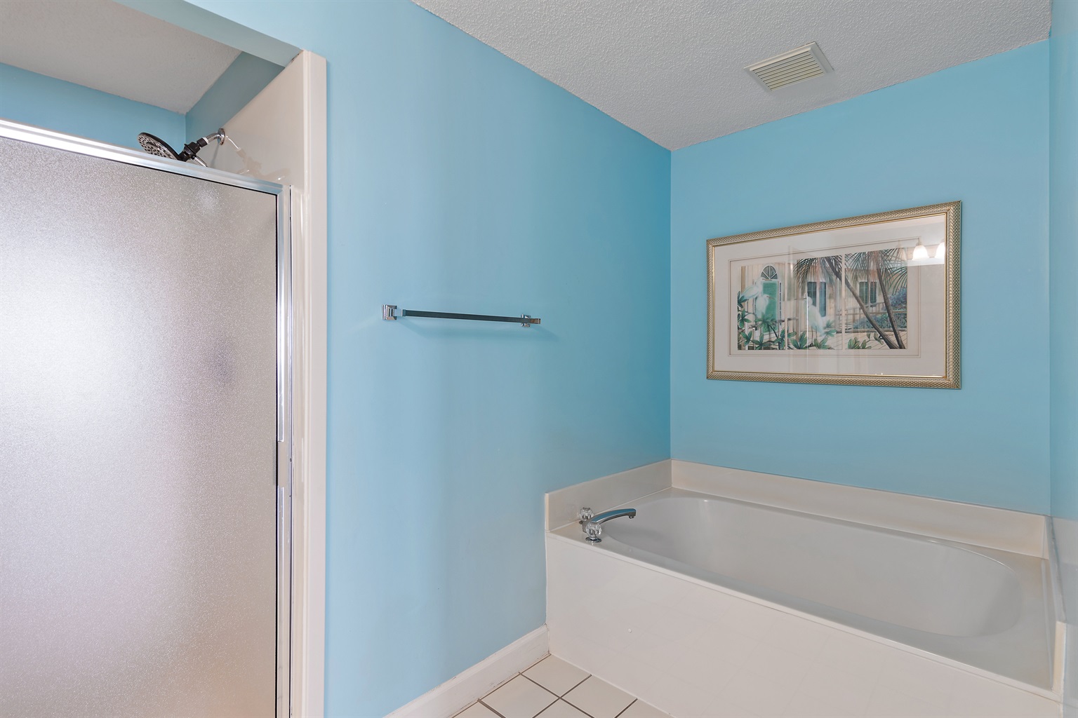 The Master Suite features a king-size bed and a large flat-screen TV. The master bath has a jetted bathtub and walk-in shower.